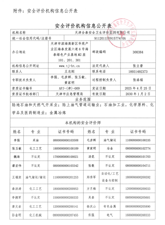 安全評價機構信息公開表——天津合泰安全衛(wèi)生評價監(jiān)測有限公司